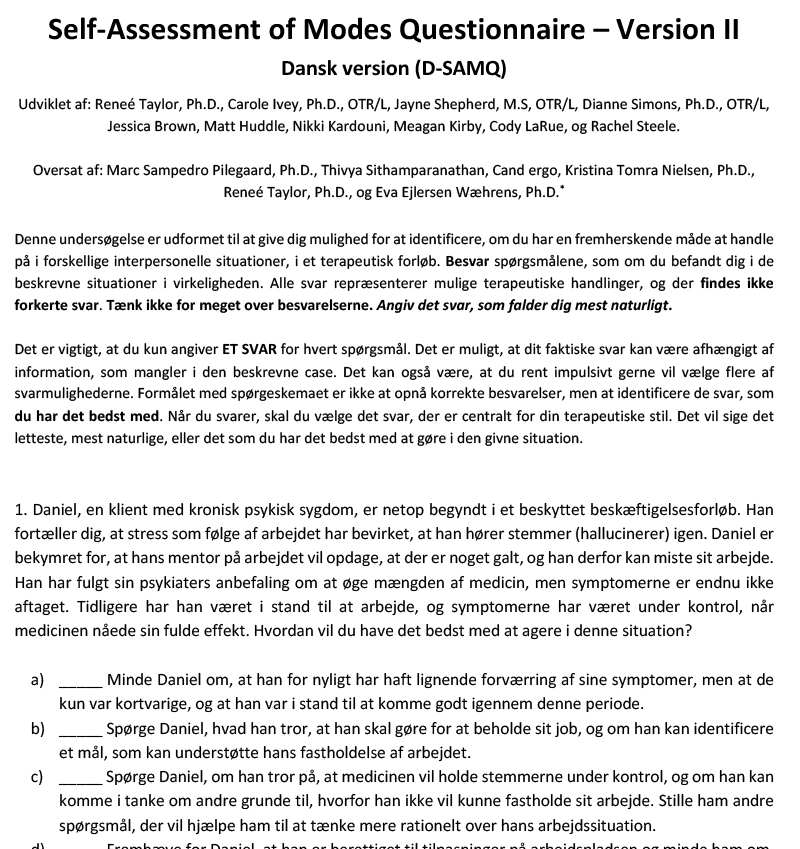 Marc Sampedro Pilegaard , Thivya Sithamparanathan , Kristina Tomra Nielsen , Renee Taylor & Eva Ejlersen Waehrens (2020): Danish translation, cultural adaptation and initial validation of the Self- Assessment of modes questionnaire (D-SAMQ), Scandinavian Journal of Occupational Therapy, DOI: 10.1080/11038128.2020.1817543