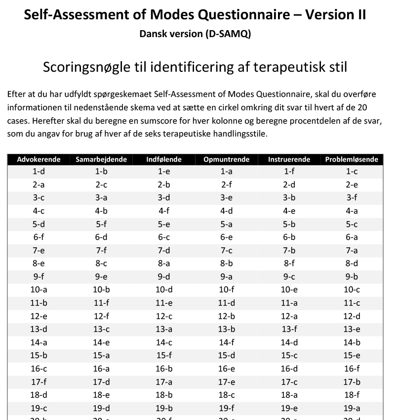 Herved fremkommer en profil over ergoterapeutens terapeutiske stil, som afspejler, i hvilken grad ergoterapeuten foretrækker at anvende de forskellige modi i terapeutiske relationer.